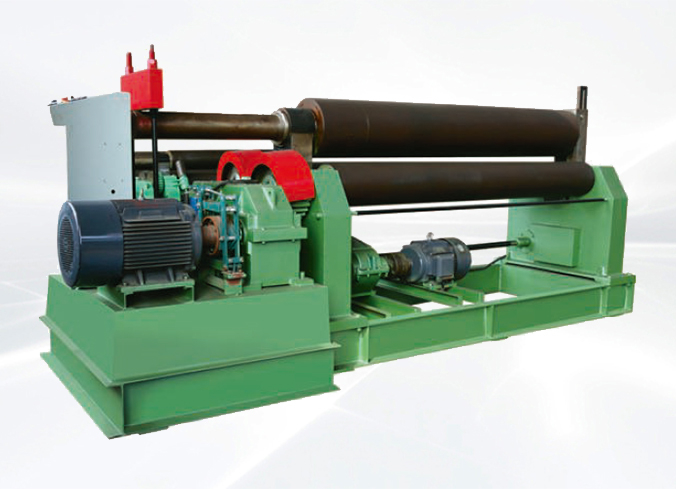 該機(jī)結(jié)構(gòu)型式為三輥非對(duì)稱式,下輥為主傳動(dòng),并做垂直升降運(yùn)動(dòng),以便夾緊板材。通過(guò)下輥齒輪與上輥齒輪嚙合,同時(shí)作為主傳動(dòng),側(cè)作傾升降運(yùn)動(dòng)。具有預(yù)彎、卷圓多重功能,結(jié)構(gòu)緊湊操作維修方便